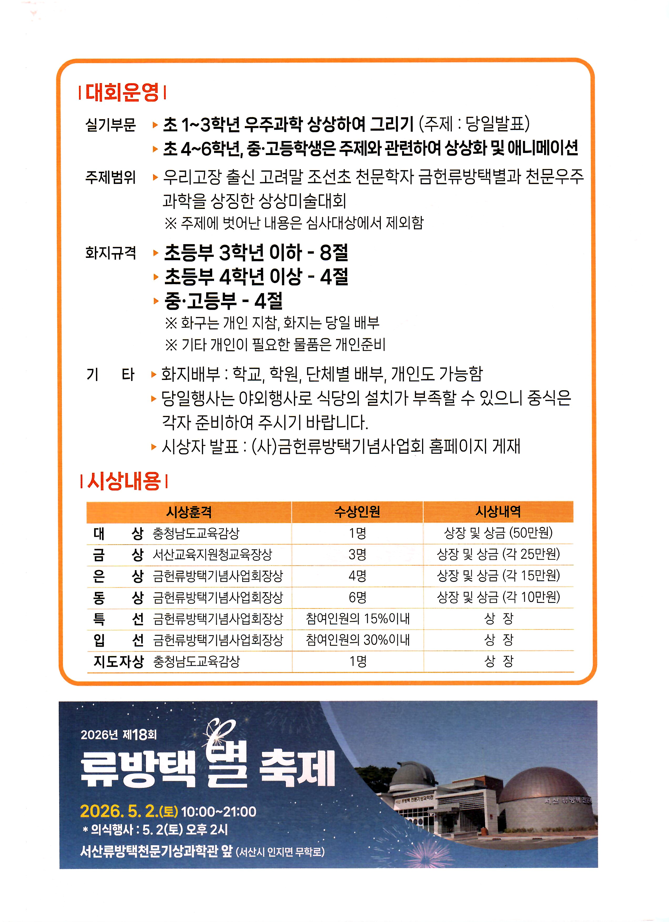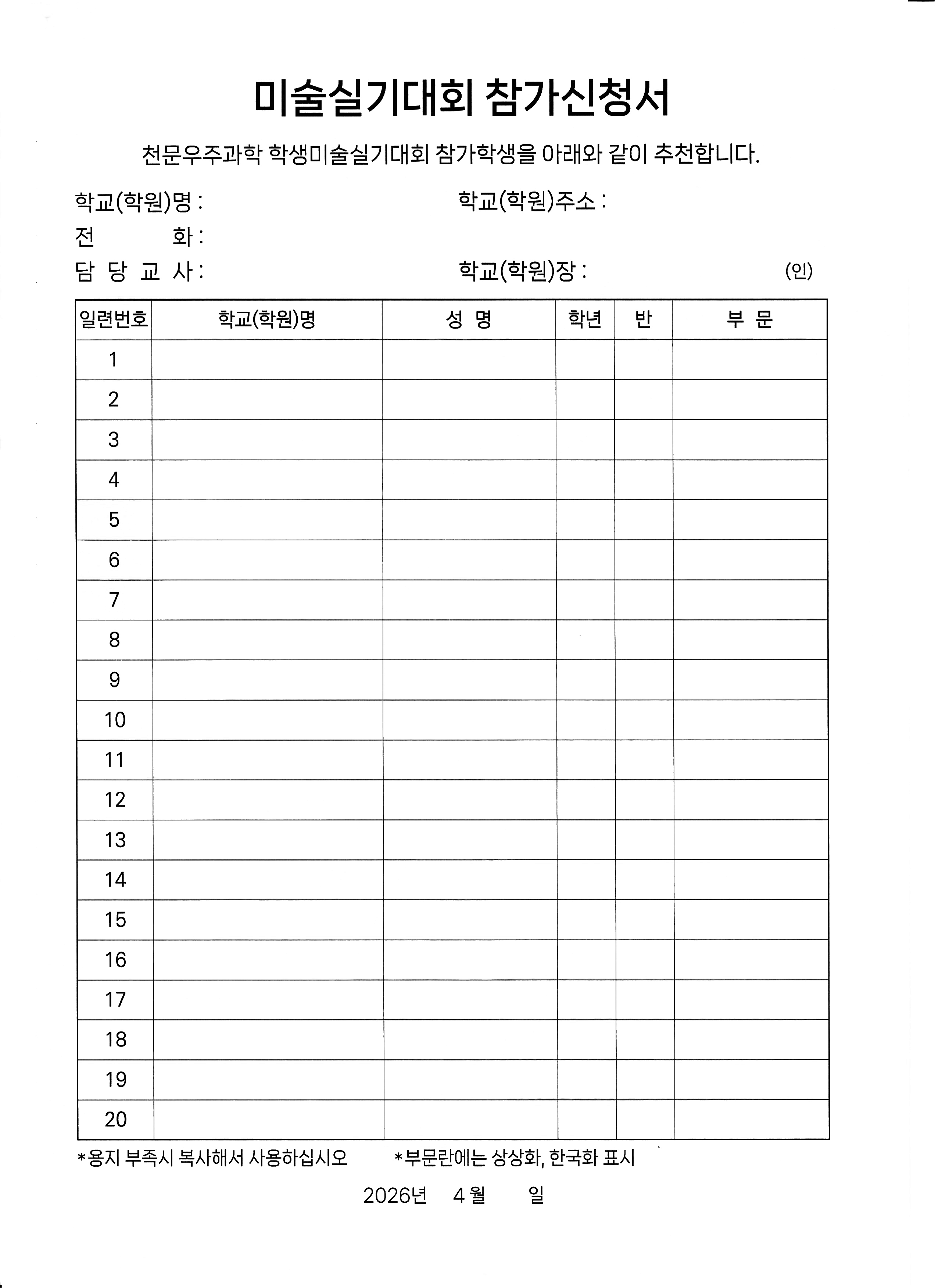 2026³â 5¿ù 2ÀÏ(Åä) ¿ÀÀü 10½ÃºÎÅÍ ¿ÀÈÄ 2½Ã±îÁö Àü±¹ õ¹®¿ìÁÖ°úÇÐ Çлý¹Ì¼ú½Ç±â´ëȸ¸¦ °³ÃÖÇÏ¿À´Ï ¸¹Àº Âü¿© ¹Ù¶ø´Ï´Ù. »ó¼¼¿ä°Àº À̹ÌÁö¸¦ Âü°í¹Ù¶ø´Ï´Ù. Âü°¡¸¦ ¿øÇϽô ºÐ²²¼´Â ¹Ì¼ú½Ç±â´ëȸ Âü°¡½Åû¼¸¦ ÀÛ¼ºÇϽþî Á¦ÃâÇÏ¿© Áֽñâ¹Ù¶ø´Ï´Ù. °¨»çÇÕ´Ï´Ù.
